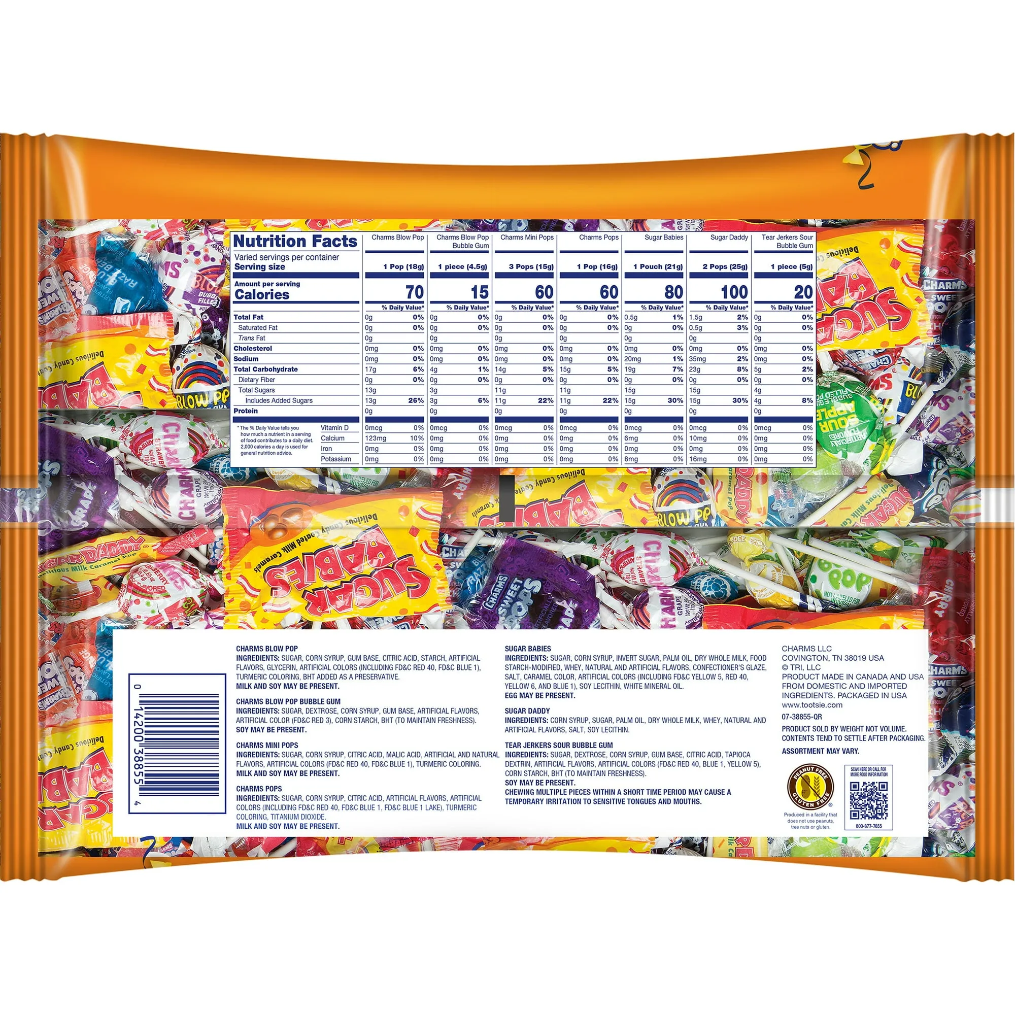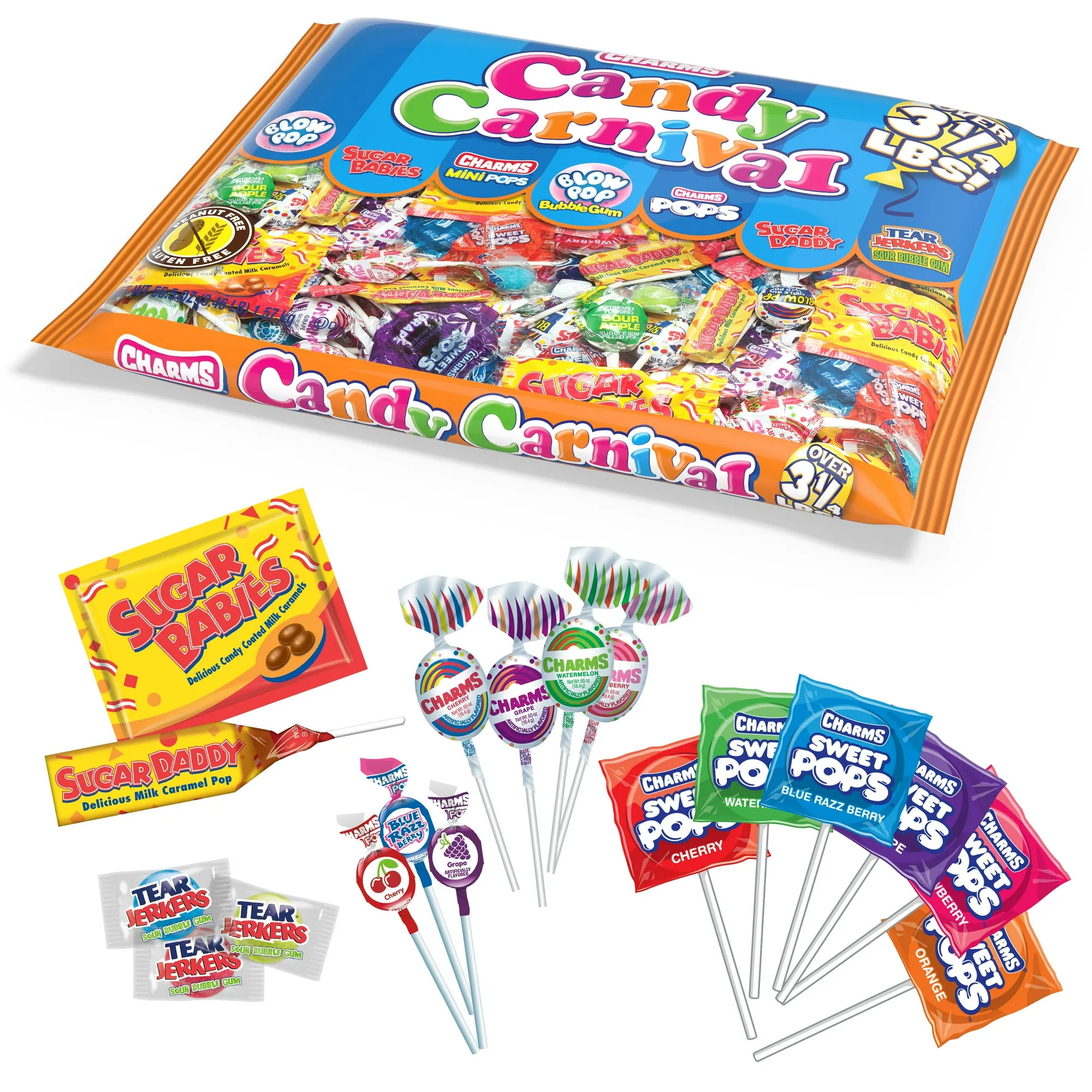 • Charms Candy Carnival – assortment of Blow Pops, Sugar Babies, Charms Mini Pops, Sugar Daddy, Charms Pops, Tear Jerker Sour Bubble Gum, and Blow Pop Bubble Gum