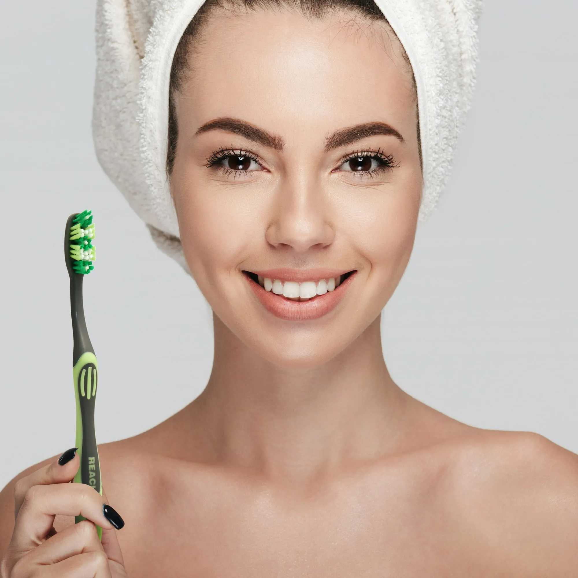 REACH Essentials toothbrush has 3 zones for a whole mouth clean, bi-level bristles for better cleaning in between teeth and gums, a Reach Tip™ to clean hard to reach places, and a unique tongue cleaner that helps remove bad breath bacteria. The pack comes with 6 toothbrushes and 5 free caps. We believe that Hard to Reach Places are worth reaching for. So no matter what your dreams are, REACH gives you the confidence to reach for them.